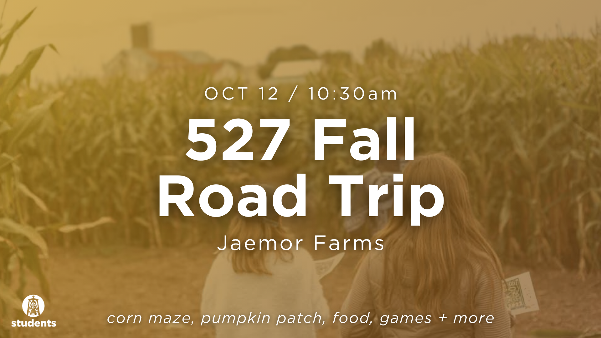 Join us for the 527 Fall Road Trip on Sunday, October 12! Drop-off will be at 10:30 AM in the Student Ministry area, and we’ll return to the church by 5:30 PM. The cost is $25, and the deadline to register is Wednesday, October 8.