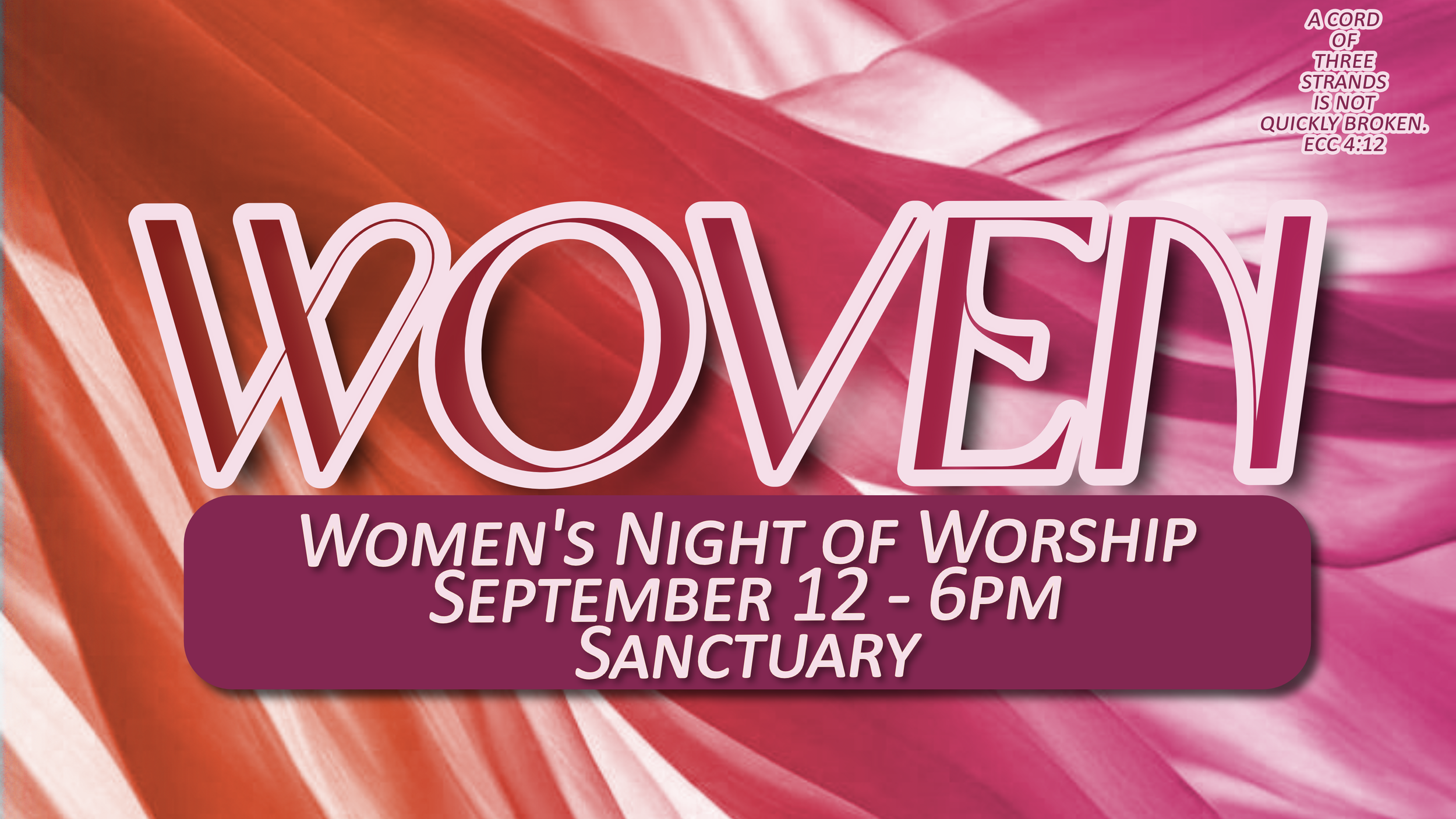 You’re invited to WOVEN: A Women’s Night of Worship on Friday, September 12, from 6:00–8:30pm in the Sanctuary. We’ll kick off the evening with a delicious catered dinner in the Courtyard (weather permitting), followed by powerful worship and an inspiring message.
