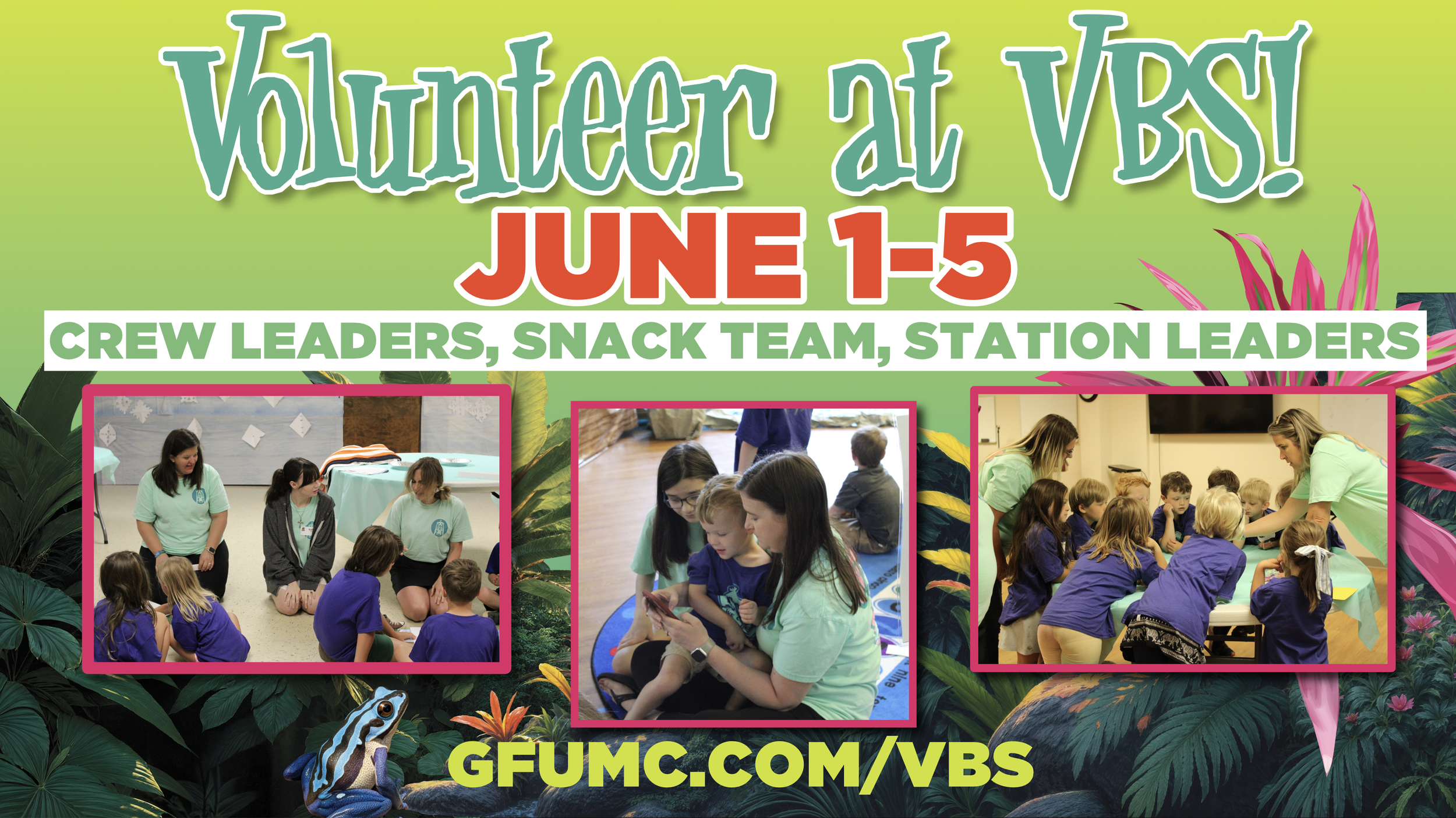 Volunteer Positions Include: Elementary Crew Leader, Preschool Crew Leader, Snack, Crafts, Bible Adventure, etc